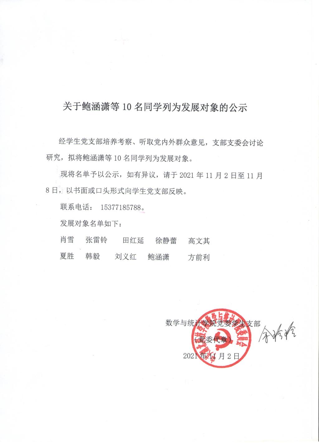 关于将鲍涵潇等10名同学列为发展对象的公示