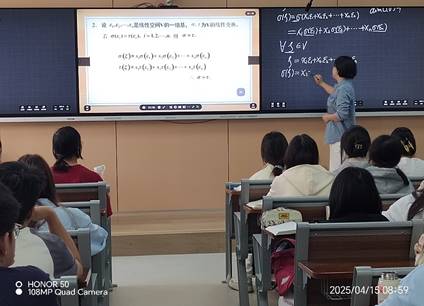 4月15日:系主任周芳老师带领大家走进了《高等代数II》的课堂。周老师以其严谨的教学态度和清晰的教学思路,为学生们构建了一个坚实的知识框架。