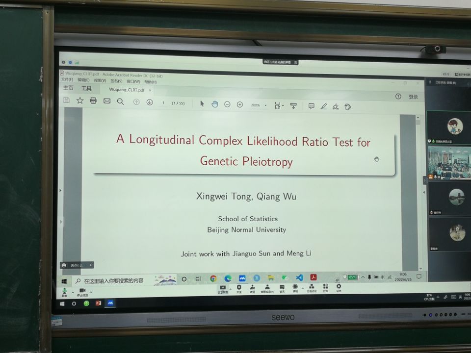 6月26日上午,北京师范大学童行伟教授应邀在数统院师范技能训练室为我院统计学专业教师作了一场题为“A Longitudinal Complex Likelihood Ratio Test for Genetic Pleiotropy”的线上学术讲座。