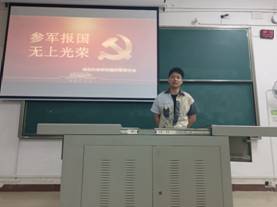 接着,来自电子与信息工程学院的韩申同学为大家讲解了征兵的要求、优惠的政策、复学就业等问题。口腔与眼视光医学院的陈绪光同学分享了他的军旅故事,并说到:“当兵后悔两年,不当兵后悔一辈子。的确,在我服兵役的这段时间当中,我深刻地体会到什么是中国速度和男子汉的责任担当,可是我并不后悔!”通过他们的讲述,同学们清楚地了解到了征兵的条件和优待,也明白军人的艰辛和磨难,同时感慨他们深厚的战友情。