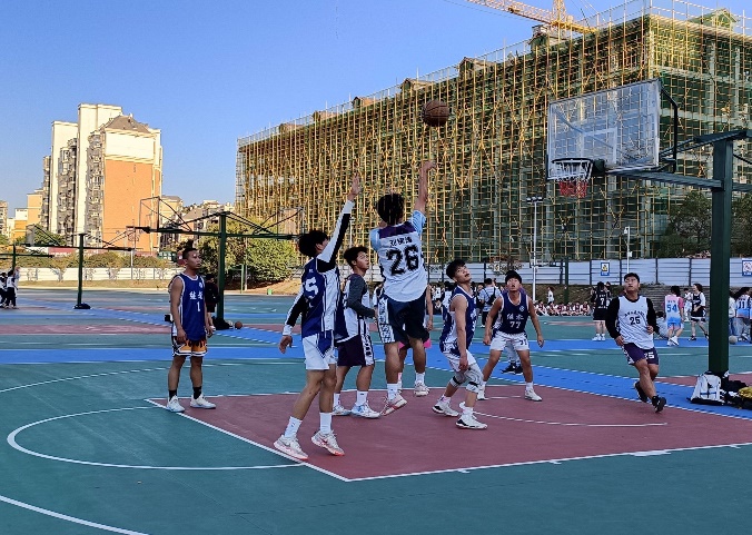球场上的激战一触即发,篮球与地面碰撞的声音就像拼搏的心跳,充满着热血和激情,球场下的同学情绪高涨,不时为队员打气、喝彩,气氛热烈。风华正茂,恰同学少年;顽强拼搏,燃数统激情。双方拼抢激烈,带球、运球、投篮等一系列动作潇洒、规范,引来围观同学一阵阵地喝彩。