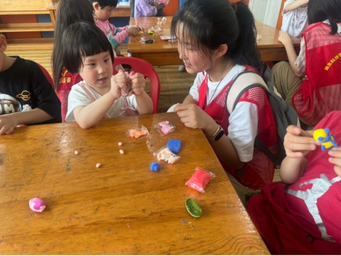 随后,志愿者们耐心地手把手教学,从基础的揉、搓、捏技巧教起,引导小朋友们用粘土塑造地球、动植物等环保造型;还带着大家利用边角料,将“废物”巧妙变成可爱的小装饰。