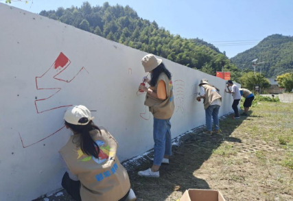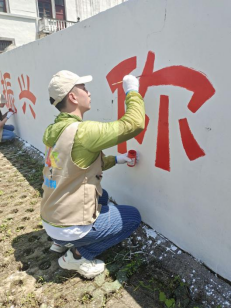 上午到达石门村后,团队成员先清除了墙上的污垢,再用白漆将整面墙刷白。待白漆干后,队员们分工合作、互帮互助,用自己手中的画笔一笔一划的勾勒出精美的字体,再配上竹子和边框,让整面墙变的整洁大方,点明了活动的主题。路过的村民纷纷称赞,用心绘制的墙绘获得了一致好评。