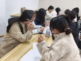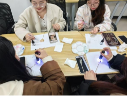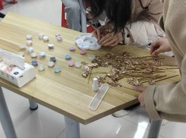 活动伊始,心理服务部干事艾彤向全体女生致以节日祝福,并详细讲解螺钿工艺的历史渊源与制作技巧。在分组协作环节,23 组参与者充分发挥创意,运用薄如蝉翼的螺钿片进行拼贴创作。蓝光灯下,七彩螺钿与素色簪体交相辉映,呈现出 "钿头银篦击节碎" 的古典美感。现场同步播放轻音乐,营造出轻松愉悦的创作氛围。