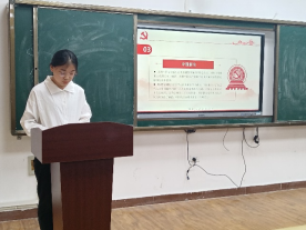唐雪腾同学结合她报名参加征兵的故事,分享了《习近平与大学生朋友们》。书中谈到了习近平总书记对新时代青年的要求,胸怀大志,报效祖国,真正成长为中国特色社会主义实业的建设者和接班人。“青年之觉醒,吾辈当自强”,邓可舒同学分享了电视剧《觉醒年代》,她指出铭记历史最好的方式就是创造新的历史,身为后辈的广大青年应胸怀国家、勇担重任,生逢盛世而不负盛世。喻汶彬同学在分享《绝笔》时提到,革命者的信仰矢志不渝,革命中的爱情感天动地,他们对党和人民事业的坚定信心是共产党人的政治灵魂,也是共产党人经受住任何考验的精神支柱。