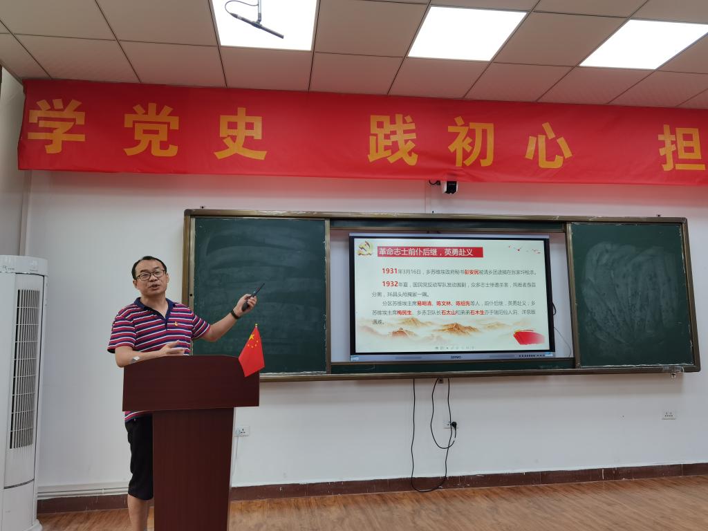 在集中学习阶段,数学教工支部书记刘良华以“赤壁市随阳山区革命根据地研究”讲微党课。党课分别从随阳山区革命根据地简介、主要革命斗争历史、在鄂东南革命根据地中的地位和作用三个方面,对赤壁市随阳山区革命根据地进行了详细研究,全景式地展示赤壁市随阳山区革命根据地的斗争历史。