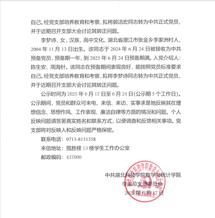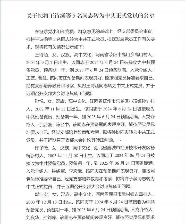 关于拟将王诗涵等5名同志转为中共正式党员的公示