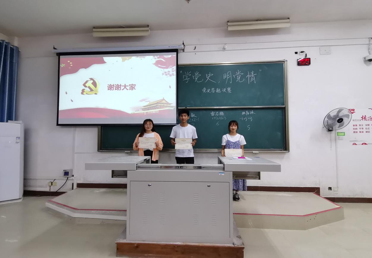 最终决赛采取抢答的模式,一共15道题目,答对计分,答错扣分。三名同学冷静思考、沉着应对,上演了一场精彩的脑力与知识的较量,以丰富的党史知识储备和精彩的临场发挥,展示了团员良好的精神风貌、扎实的知识储备和比学赶超的学习劲头。决赛结束,雷志鹏获得本次比赛第一名,欧阳冰获得第二名,何敏获得第三名,主持人为他们颁发证书,所有参赛人员都为他们热烈鼓掌。