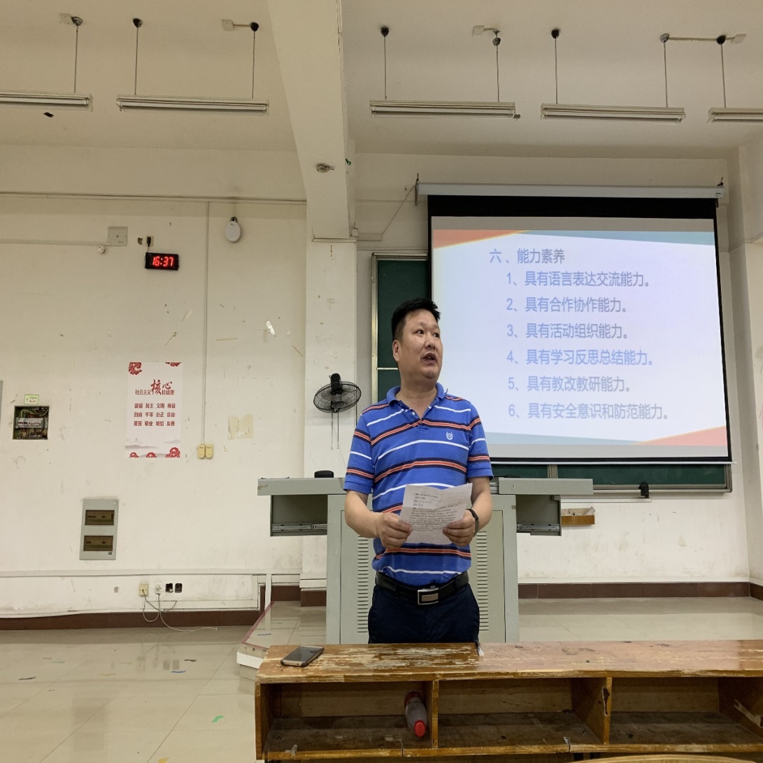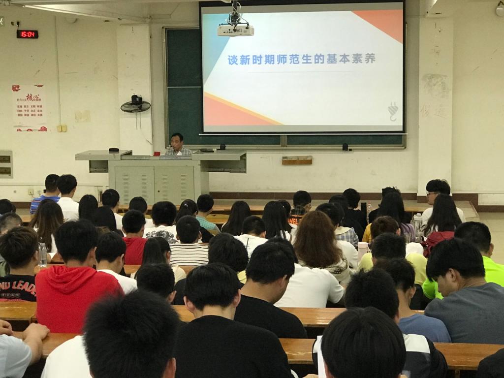 陈绪元老师分别从欧美教育的教师培养、新时期我囯教育思想以及新时期师范生应具备的素养三个方面进行讲授。他以“欧美教育的教师培养”为切入点,和师生们一同探讨新教育背景下学习方式的变革与时代发展趋势对未来教育的影响,通过中学教学实录,引发师生们对未来教育对象的深入思考。陈老师从新时代数学教师基本素养国家要求和实践要求的角度,阐释了职业素养、师德素养、教育素养、身心素养以及能力素养等育人理念,希望学院师生用职业标准、职业规范统领师范学习和教育实践,知行合一,立志做“四有”好老师,做学生学习的促进者和成长的引路人。