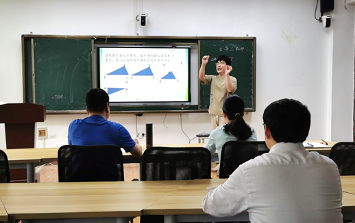 参加此次考核的李徐同学采用信息化PPT和传统教学结合的手段,划分了情景导入、探究新知、应用巩固、小结反思四个板块循序渐进地对《全等三角形》进行了教学讲解。全体评委老师们认真聆听,并对该同学认真的教学态度、自然完整的教学过程以及充分的教学准备给予了充分肯定,同时也提出板书不充实、难点不突出等不足之处。最后,评委为李徐打出考核分数,该同学顺利通过教师能力考核。