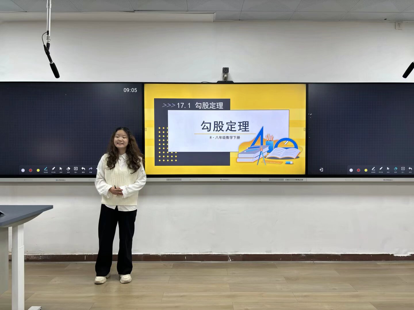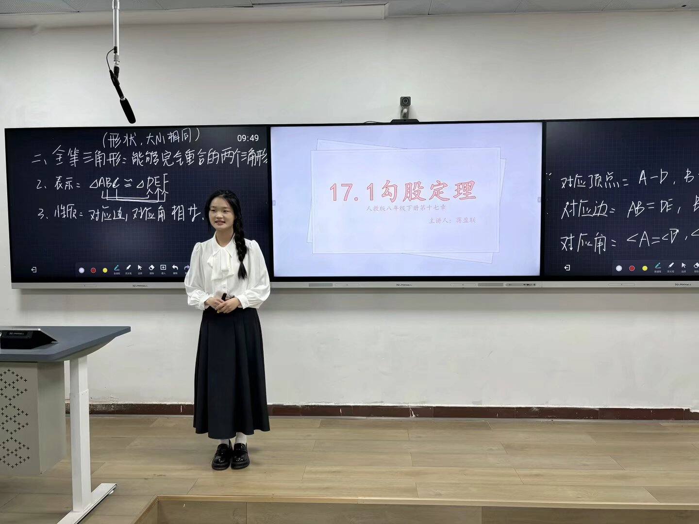 在本次比赛中,数学学科的参赛同学表现尤为突出。22数应二班蒋盈联蒋同学带来的《17.1勾股定理》课程,逻辑清晰,从生活实例出发引导学生探索定理,借助动画演示勾股定理的证明过程,让复杂的数学知识变得通俗易懂。