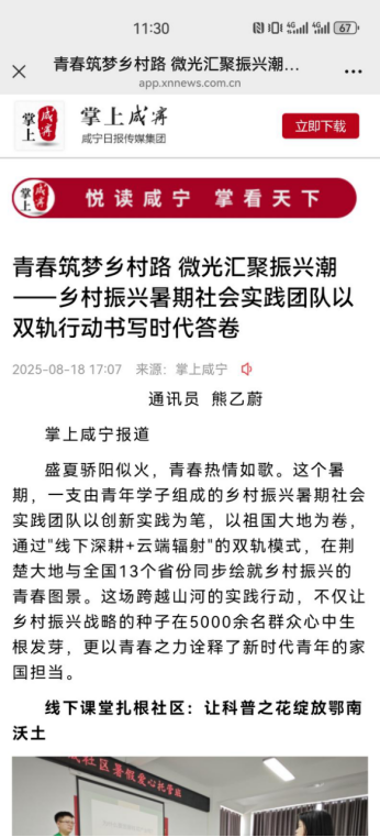 (通讯员:熊乙蔚)盛夏骄阳似火,青春热情如歌。这个暑期,一支由青年学子组成的乡村振兴暑期社会实践团队以创新实践为笔,以祖国大地为卷,通过"线下深耕+云端辐射"的双轨模式,在荆楚大地与全国13个省份同步绘就乡村振兴的青春图景。这场跨越山河的实践行动,不仅让乡村振兴战略的种子在近万名群众心中生根发芽,更以青春之力诠释了新时代青年的家国担当。